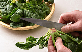 ★ほうれん草は軸の火の通りを良くするために、軸に切れ目を入れる。